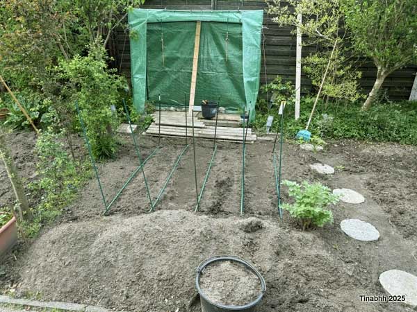 Vorbereitung zur Aussaat von Erbsen und im Hintergrund das Tomatenhäuschen.