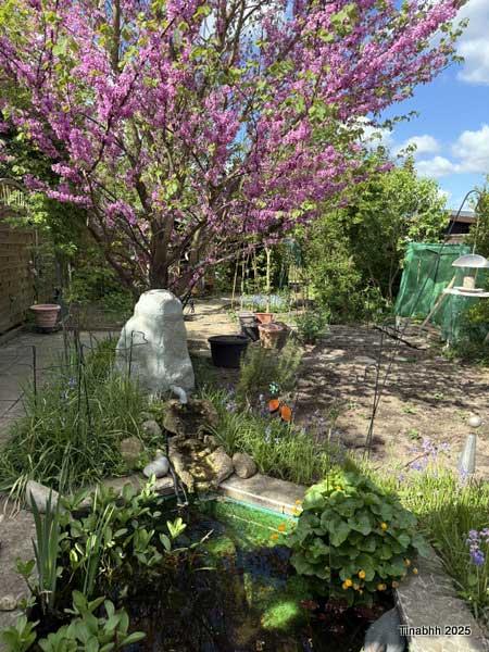 Blühender Judasbaum hinter dem Gartenteich