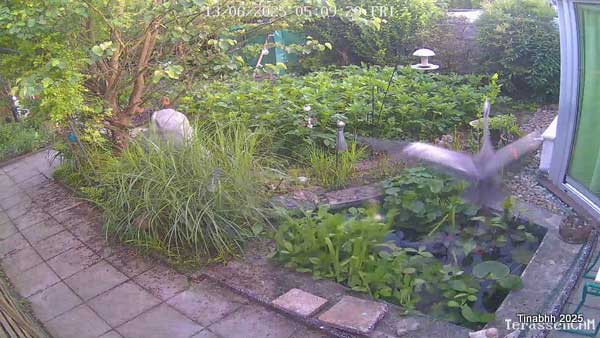 Trotz Schutznetz über dem Teich versucht der Reiher Beute zu machen.